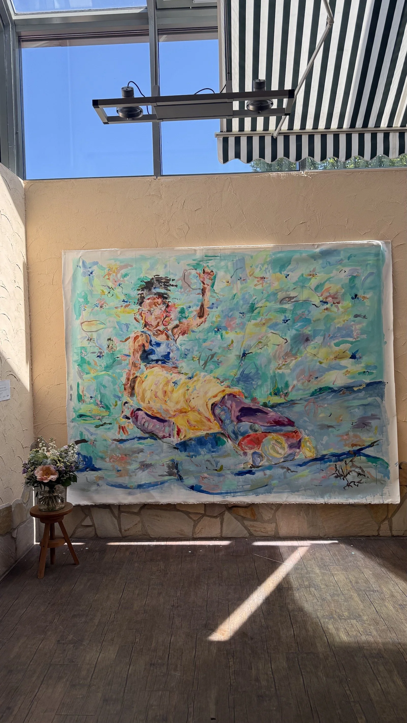 Sobald das Werk auf seinen stabilen Keilrahmen aufgezogen ist, entfaltet es seine volle Raumwirkung: kraftvoll, präsent, aber nie aufdringlich. Durch das imposante Format wirkt das Werk wie ein eigenes Statement im Raum. Ein Bild, das bleibt – in seiner Energie, in seiner Haltung, in seiner Wirkung.