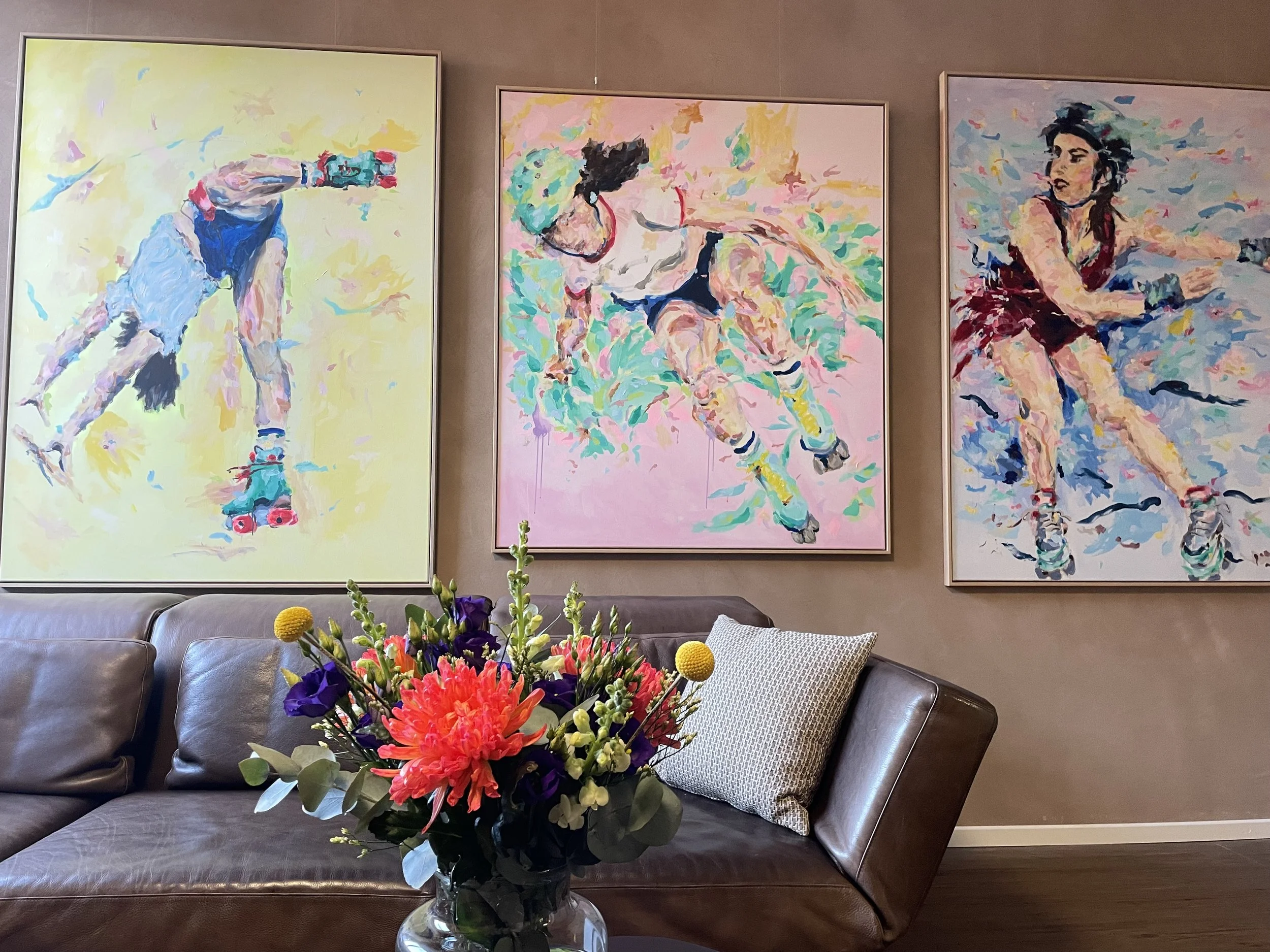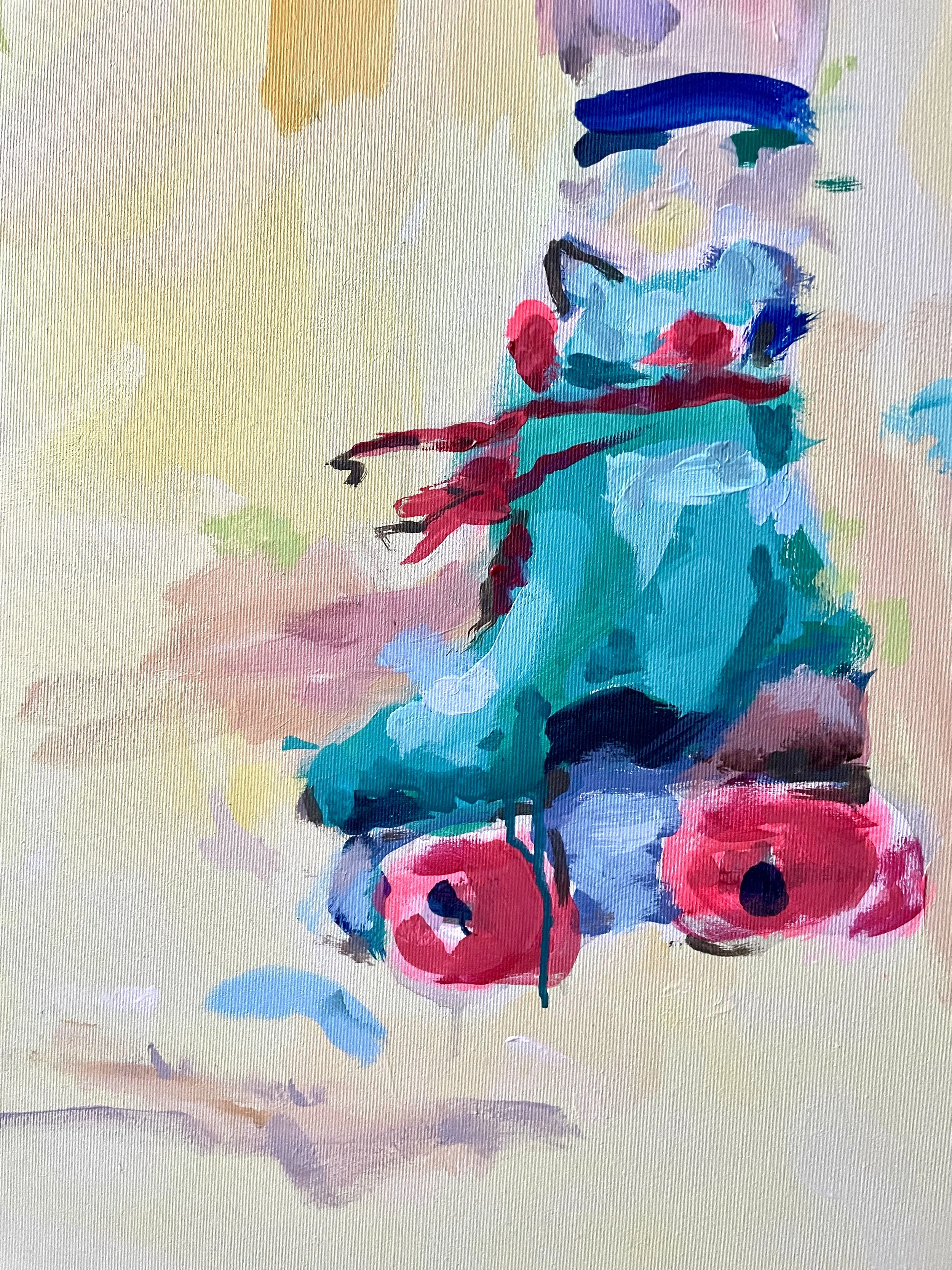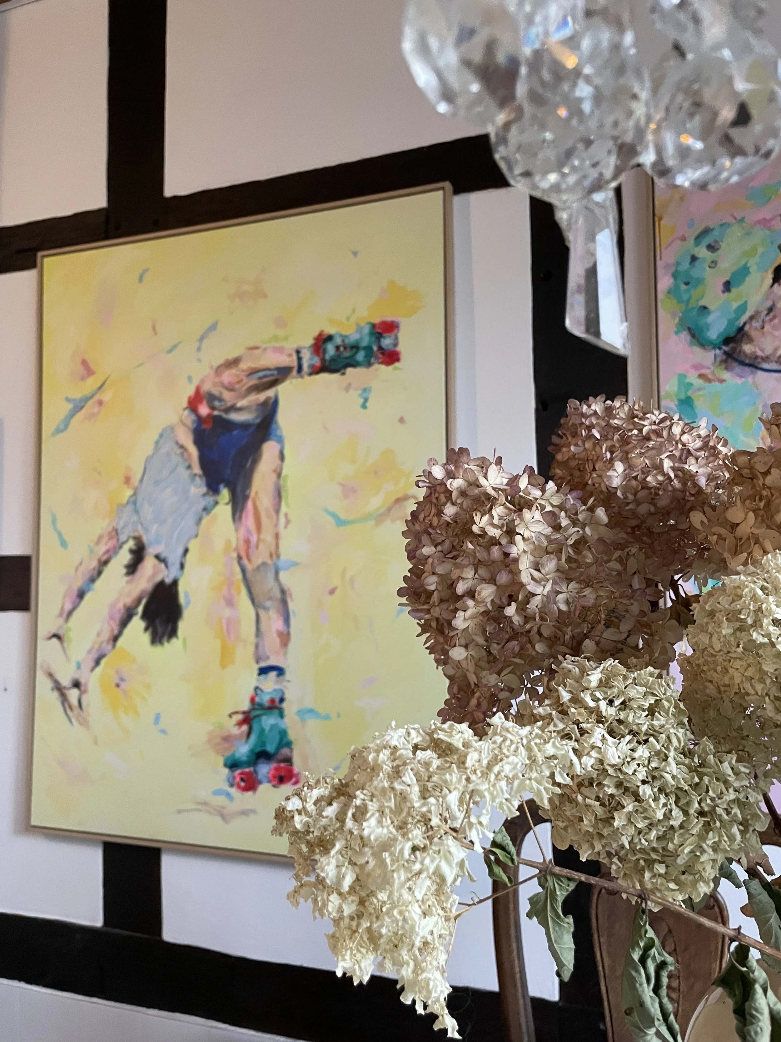 Die kraftvollen Farben und Pinselstriche von Freestyle Flex sprühen vor Energie. Das warme Gelb des Hintergrunds schafft eine weite, einladende Bühne, während die frischen Blau- und Grüntöne die Bewegung der Rollschuhfahrerin lebendig werden lassen.